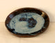 Plato de forma circular con pestaña, realizada en cerámica con colores metálicos dorado y cobre en fondo marrón. Tamaño pequeño, medidas: Ø12X2 cm.