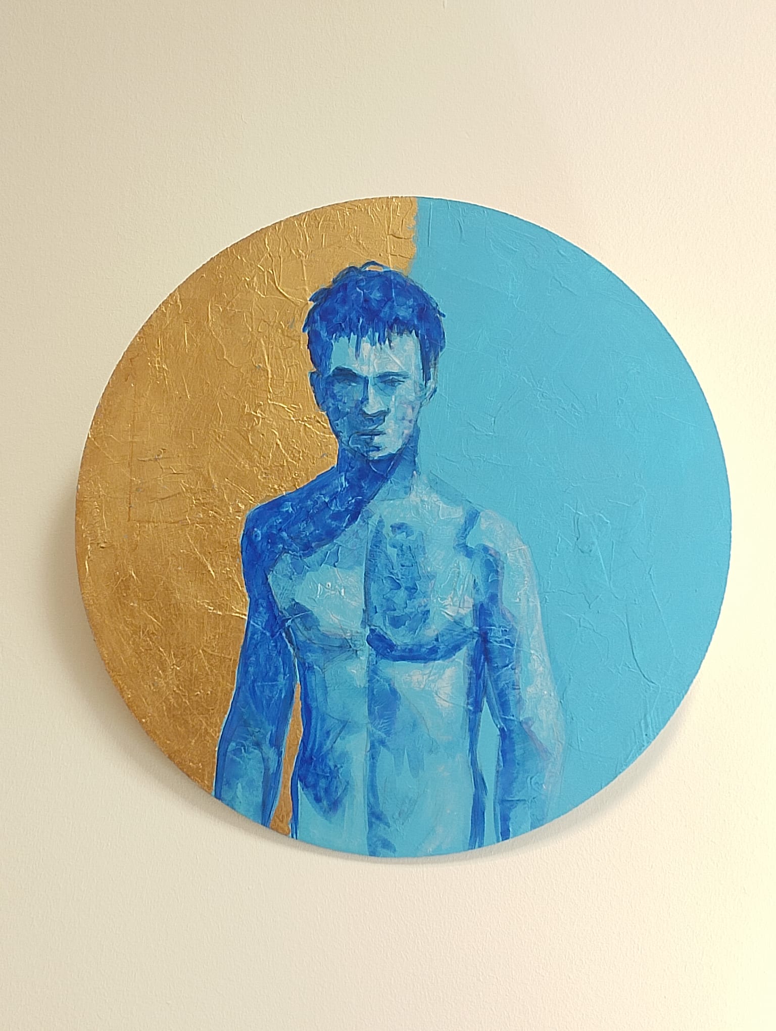 Pintura de Darío Hernánadez, técnica acrílico y pan de oro sobre madera. en formato circular de 35cm de diámetro.