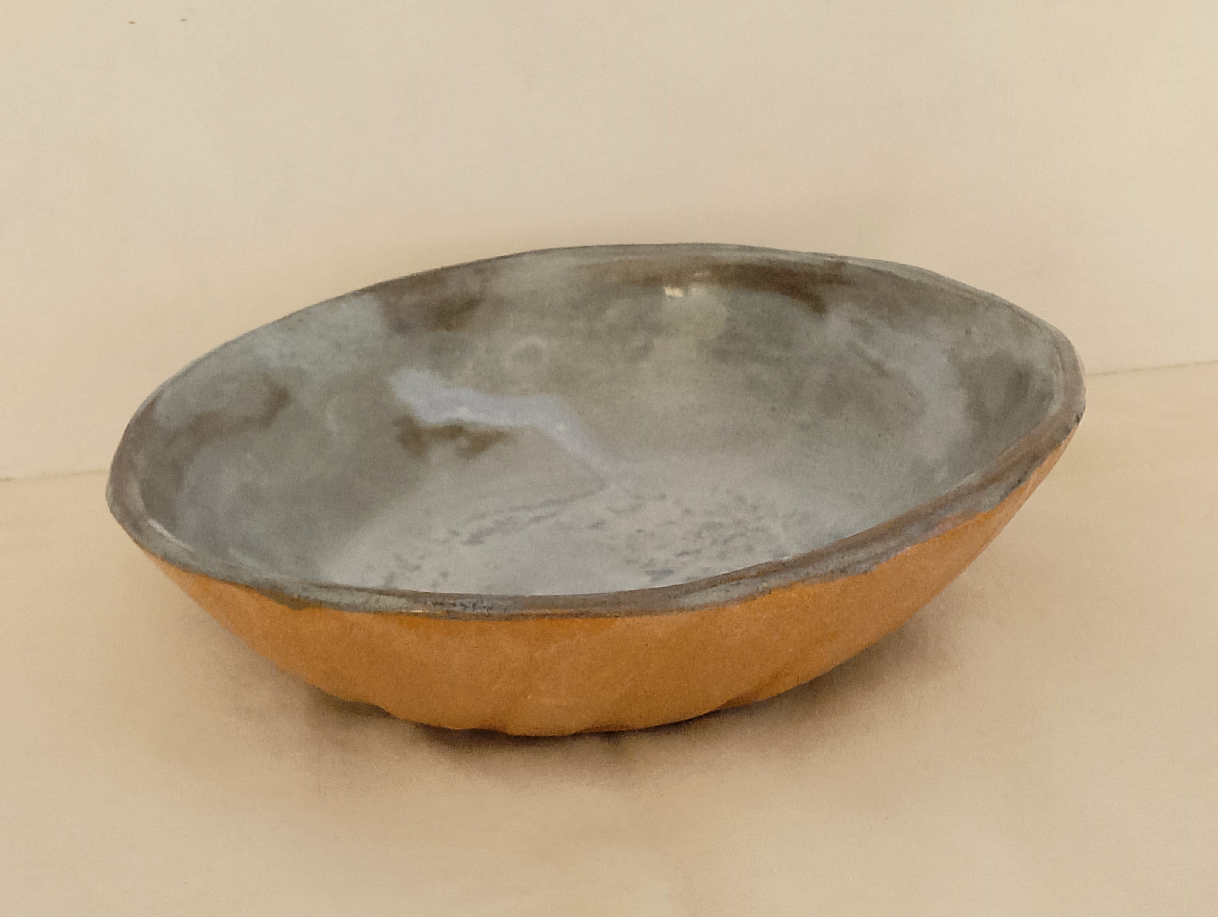 Cuenco de cerámica hecho a mano en estilo rústico en color azul claro. Tamaño mediano, medidas 16X15X5 cm.