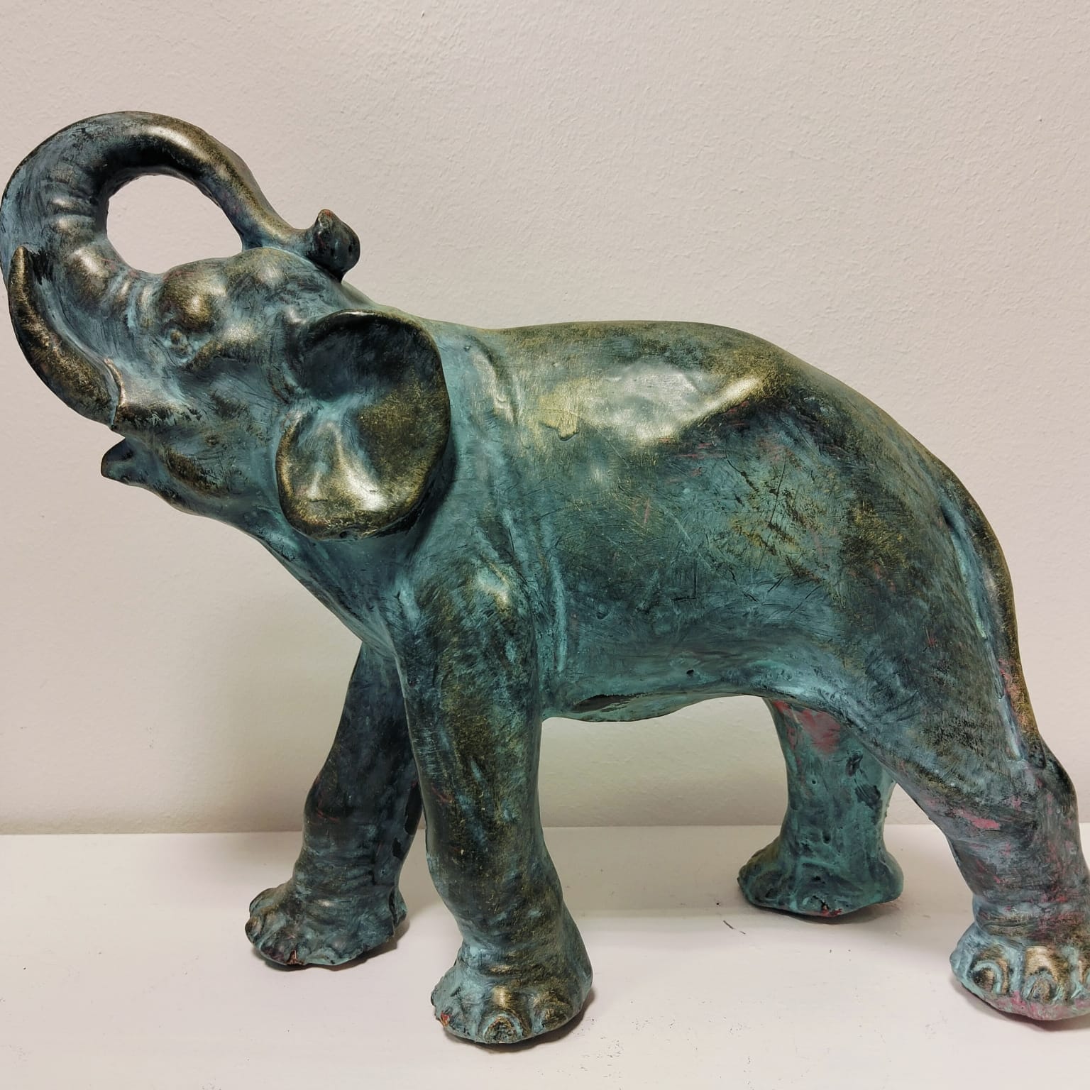 Figura de elefante con pátina de óxido de bronce con tonalidades verdosas. Medidas: 25x25x10cm.