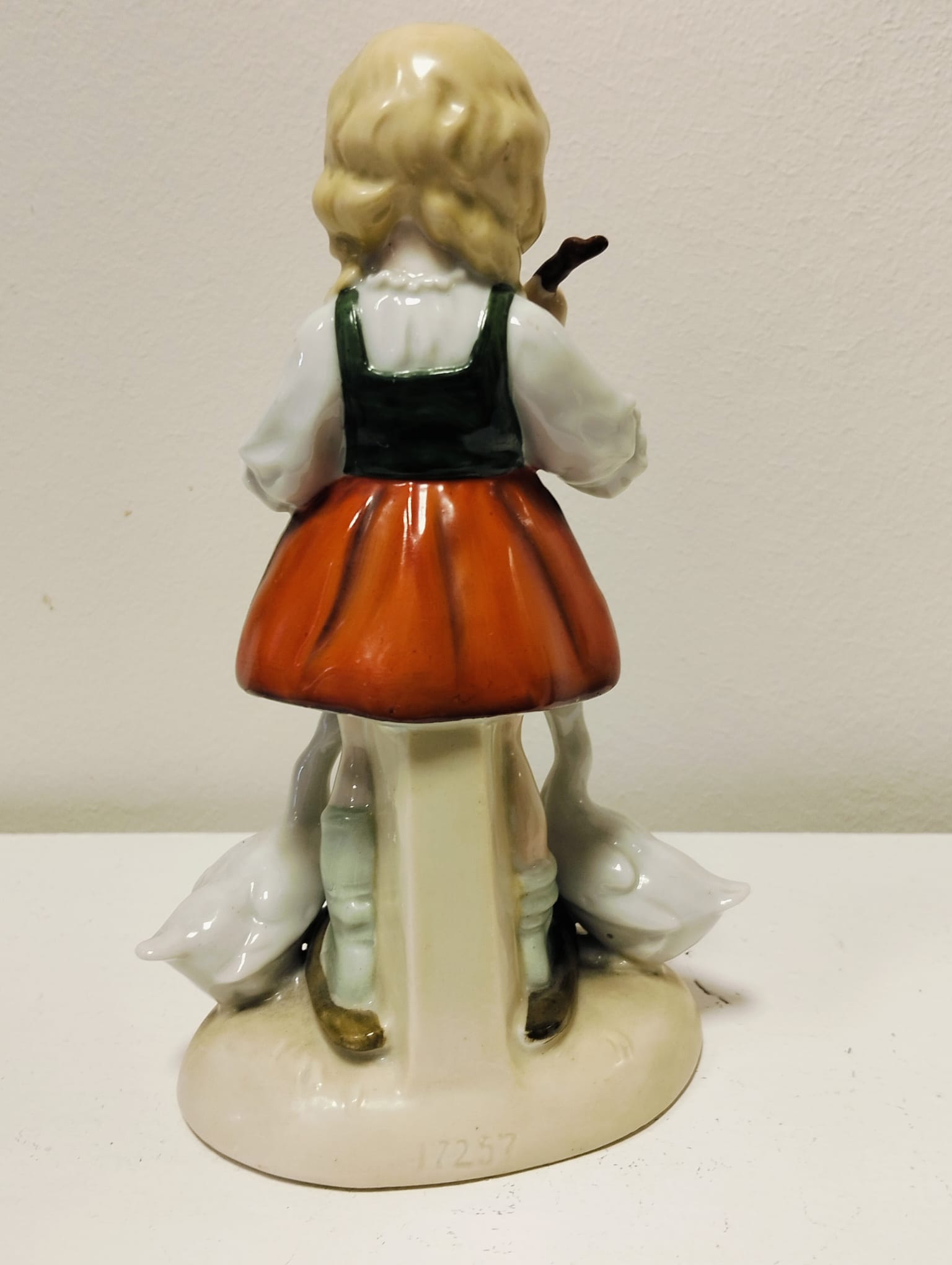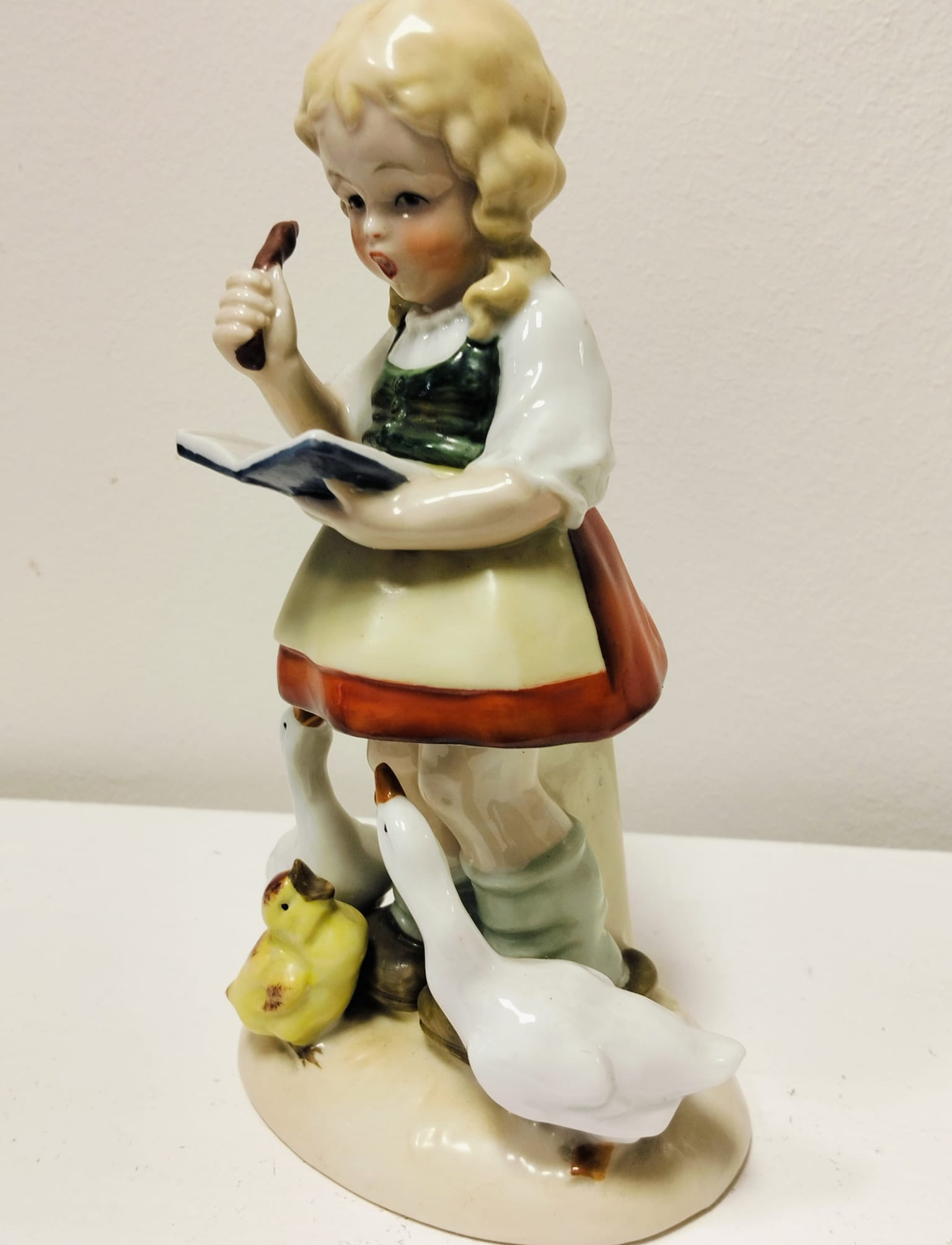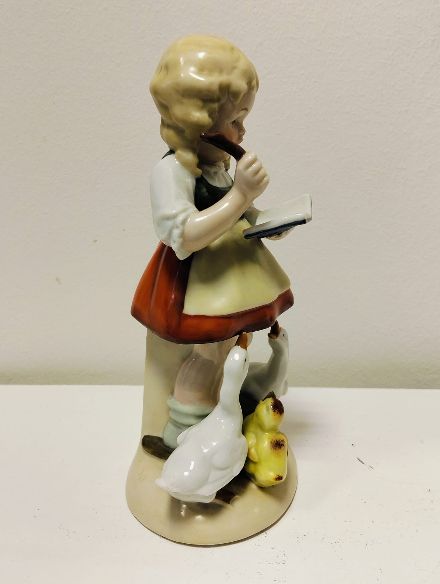 Figura de porcelana hecha a mano, que representa una niña con patos. Pertenece a la porcelana alemana, estilo Hümmel Goebel, años 30. Mide 18X7cm.