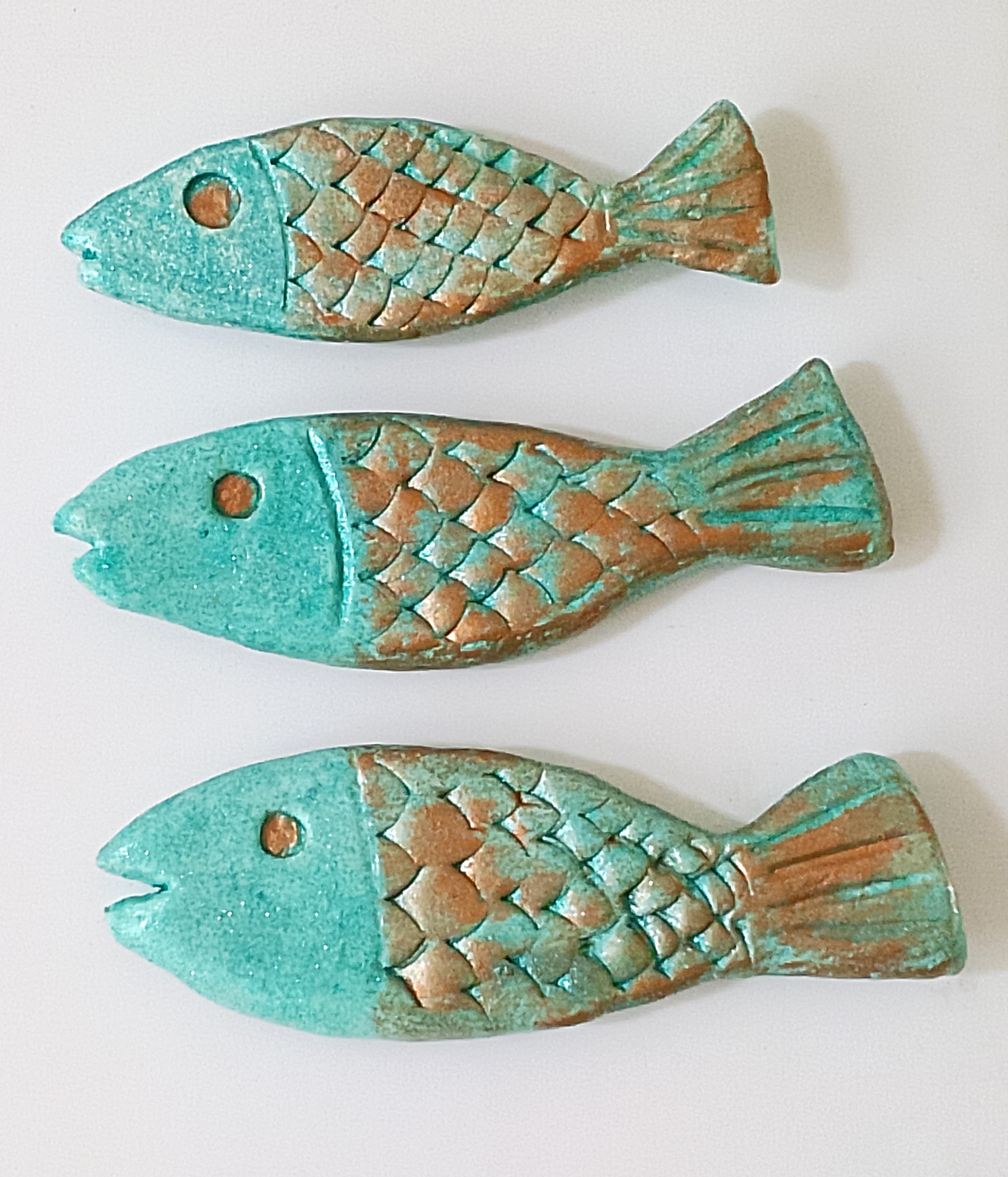 Imán para nevera, con foma de pez, hecho en cerámica y de color verde turquesa con tonos dorados en las escamas. Tamaño mediano, medidas 12X4X1 cm.