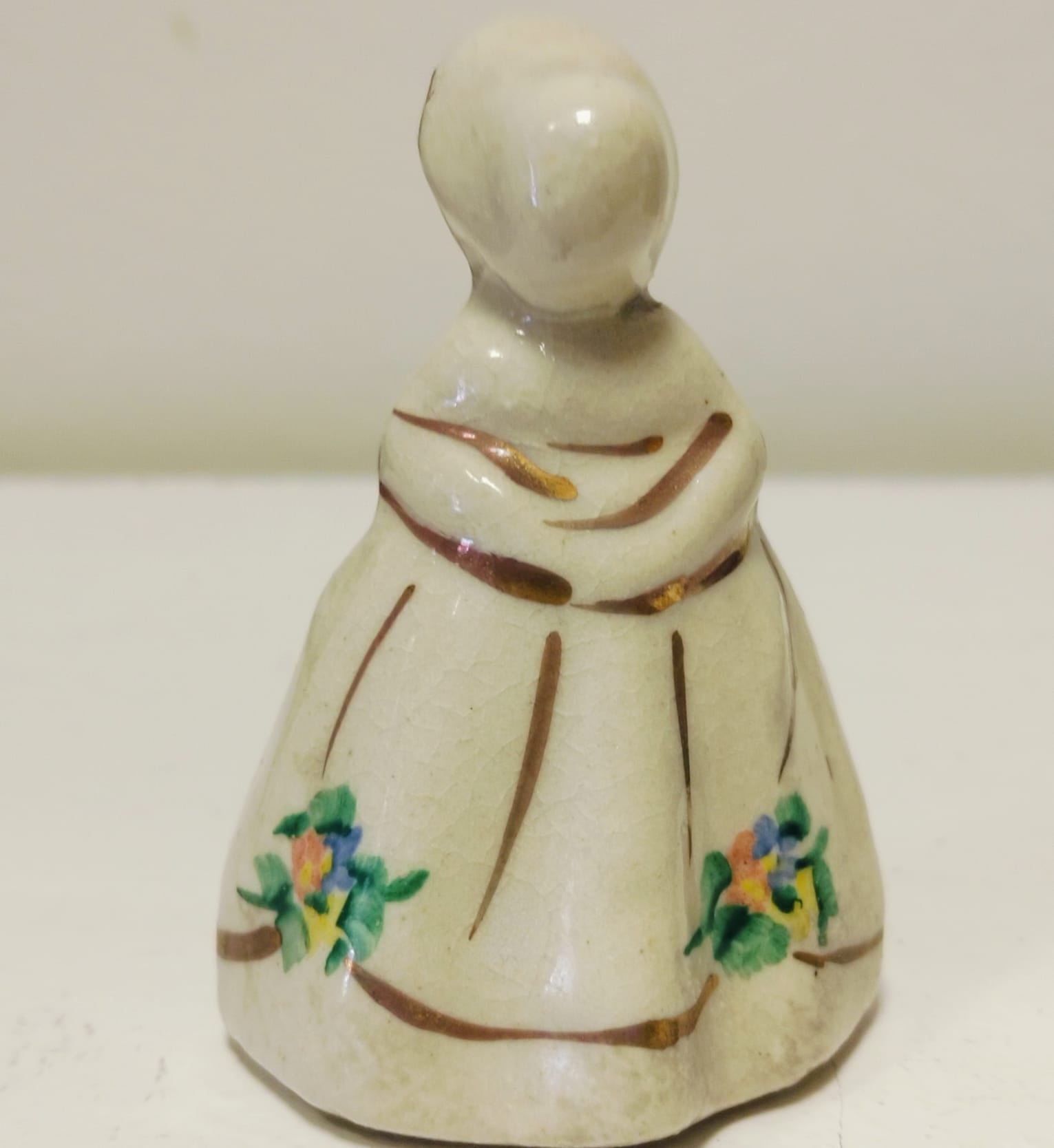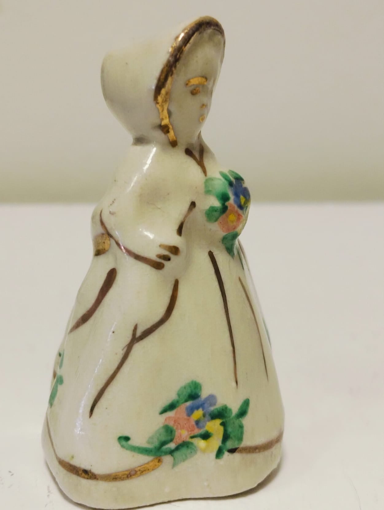 Pequeña figurita de porcelana, que representa una niña con un ramo de flores. Esta pintada a mano y mide 6cm de alto por 3.5cm de diámetro.