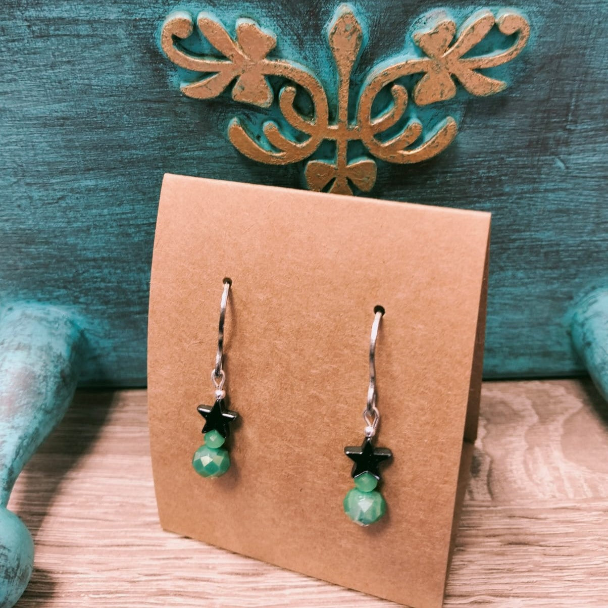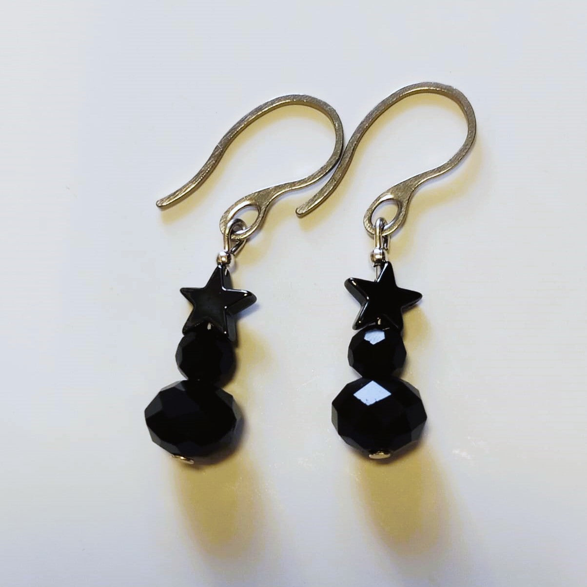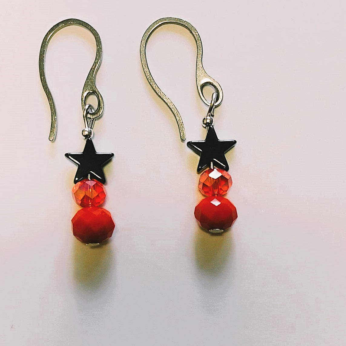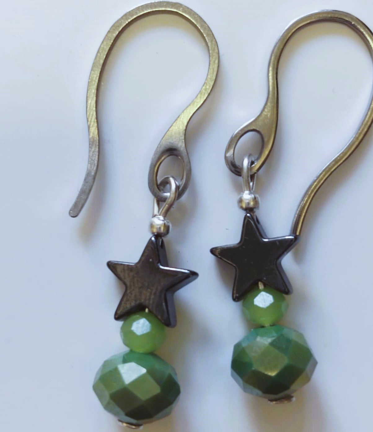 La colección de Navidad en pendientes está formada por abalorios de vidrio facetado en colores blanco, naranja (muy fuerte, casi fosforito), negro, verde claro, marrón caramelo. son colores vibrantes que no se aprecian bien en la foto. Simulan un arbolito de navidad con la estrella en la punta. Como siempre...