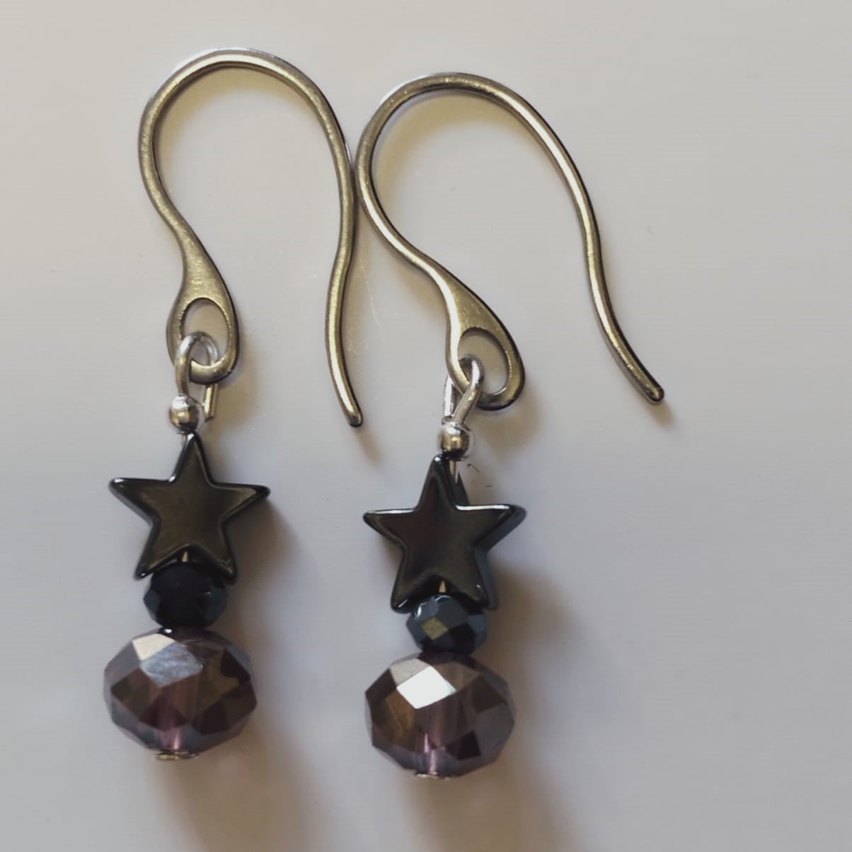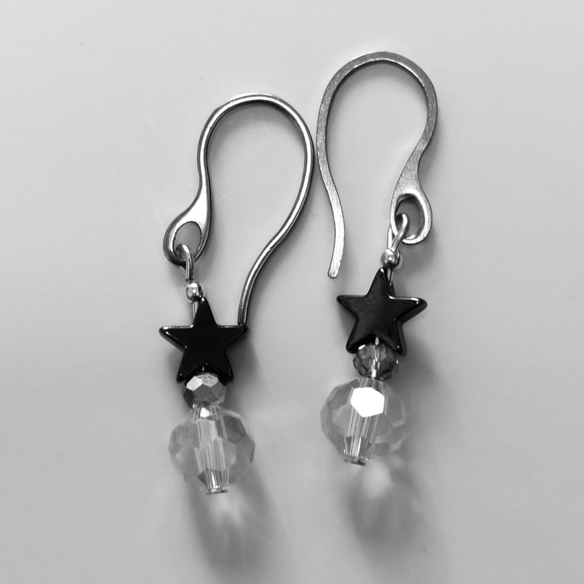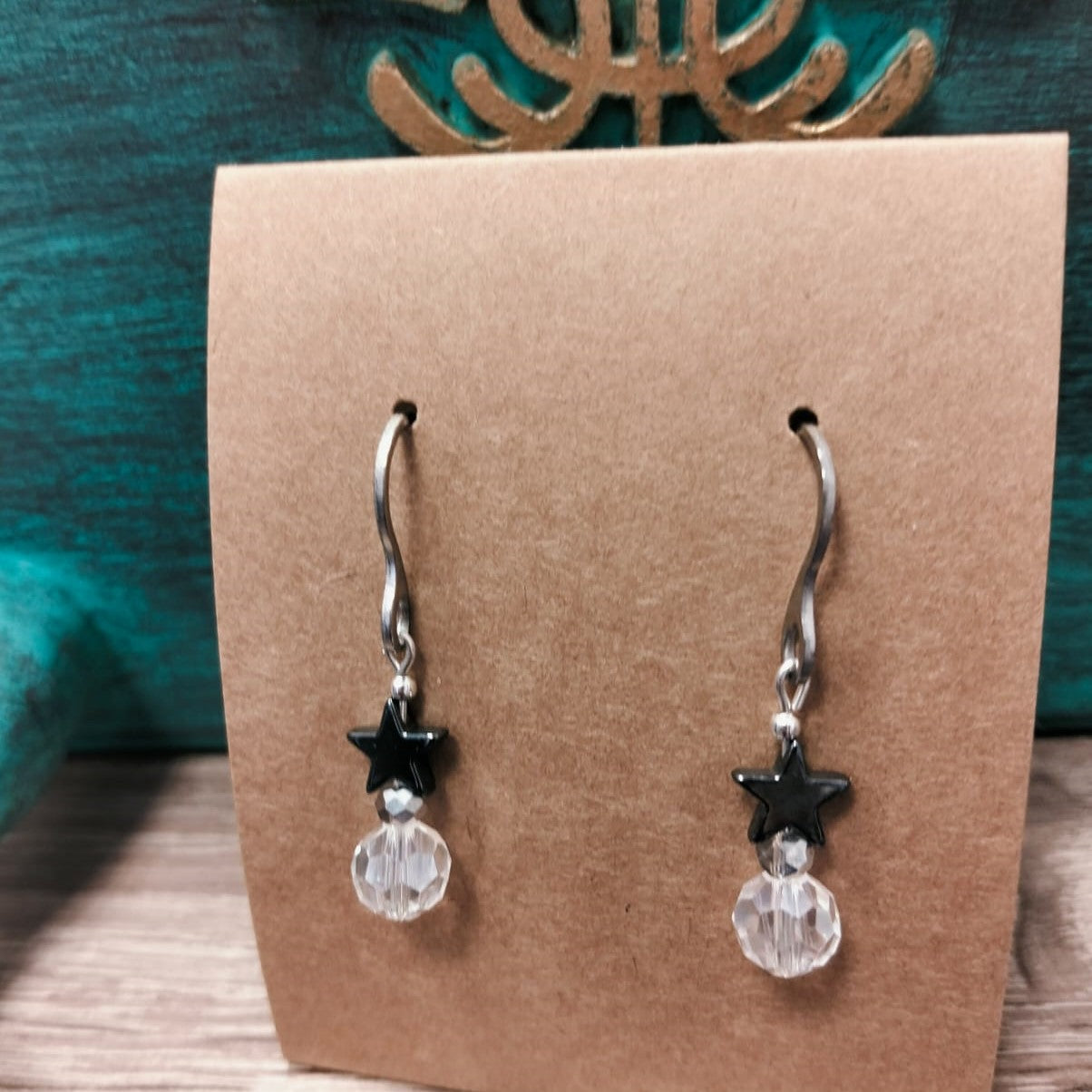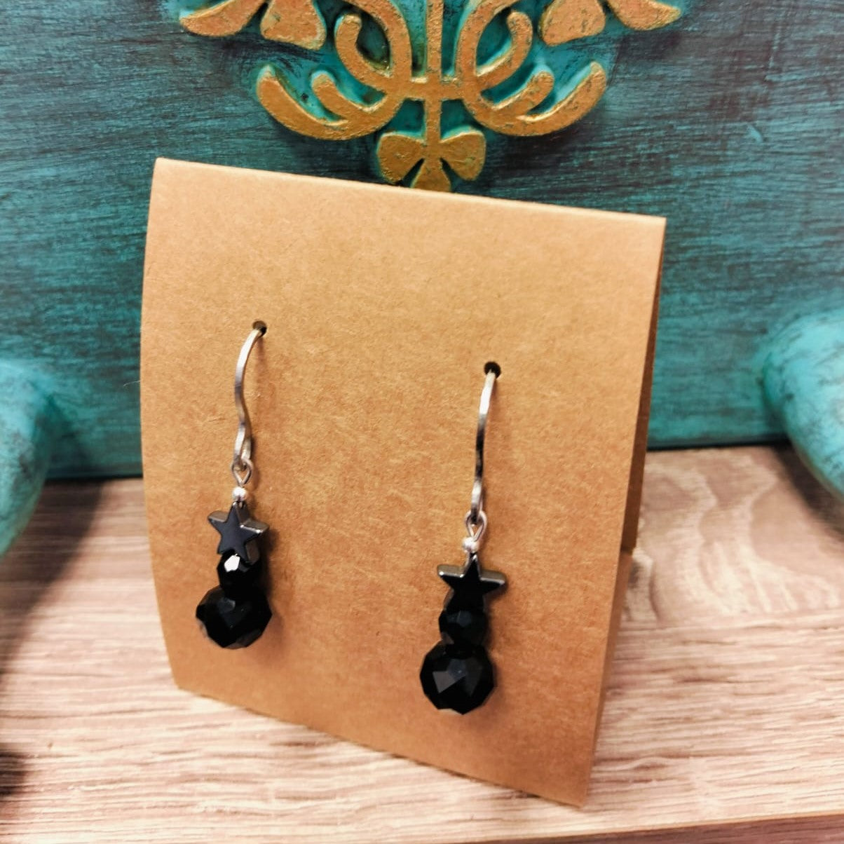 La colección de Navidad en pendientes está formada por abalorios de vidrio facetado en colores blanco, naranja (muy fuerte, casi fosforito), negro, verde claro, marrón caramelo. son colores vibrantes que no se aprecian bien en la foto. Simulan un arbolito de navidad con la estrella en la punta. Como siempre...