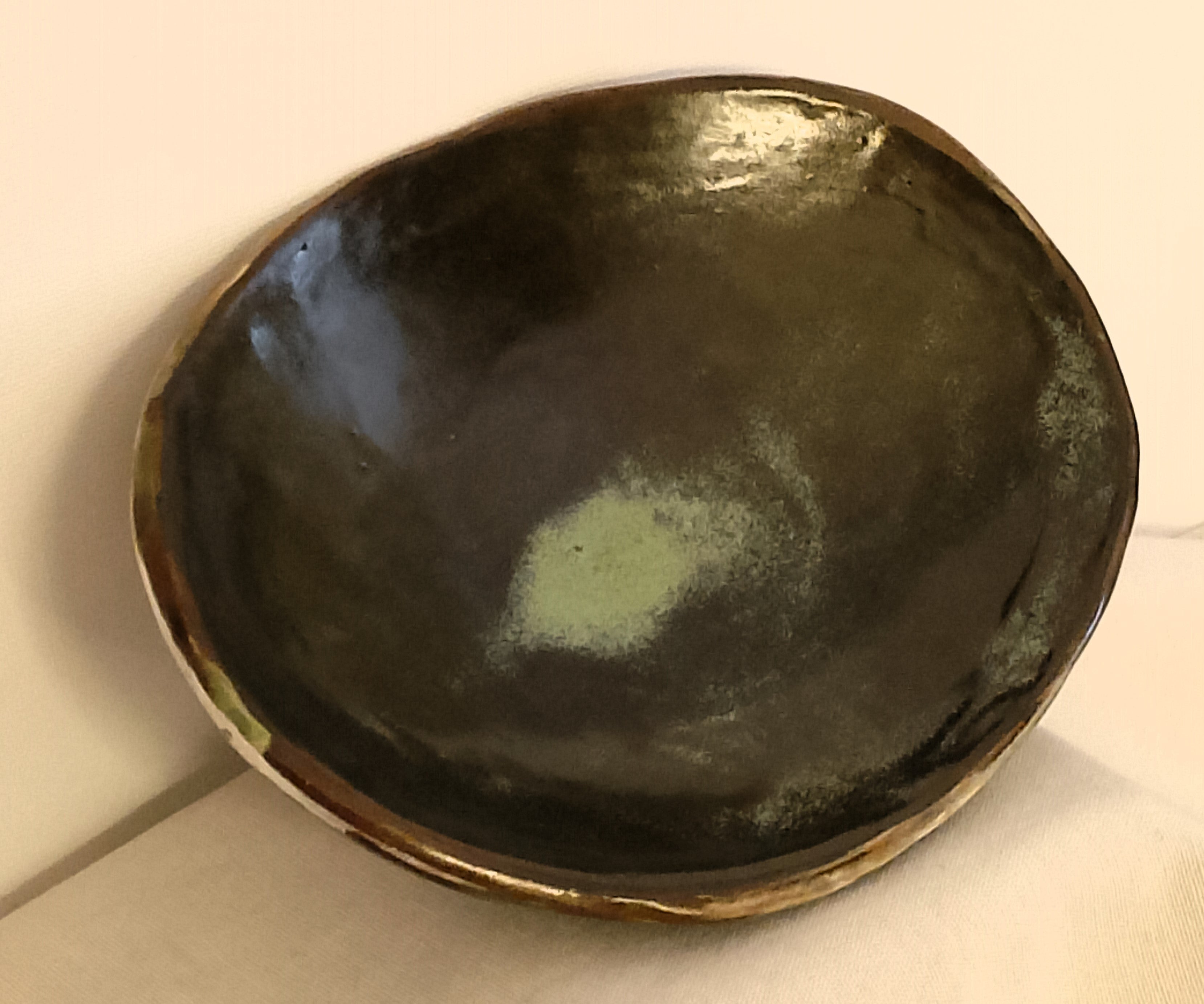 Plato de cerámica, de color beige y líneas circulares grises. Múltiples usos como plato de aperitivos, jabonera, descansa bolsillos, etc.. Tamaño pequeño, medidas Ø13X3 cm.