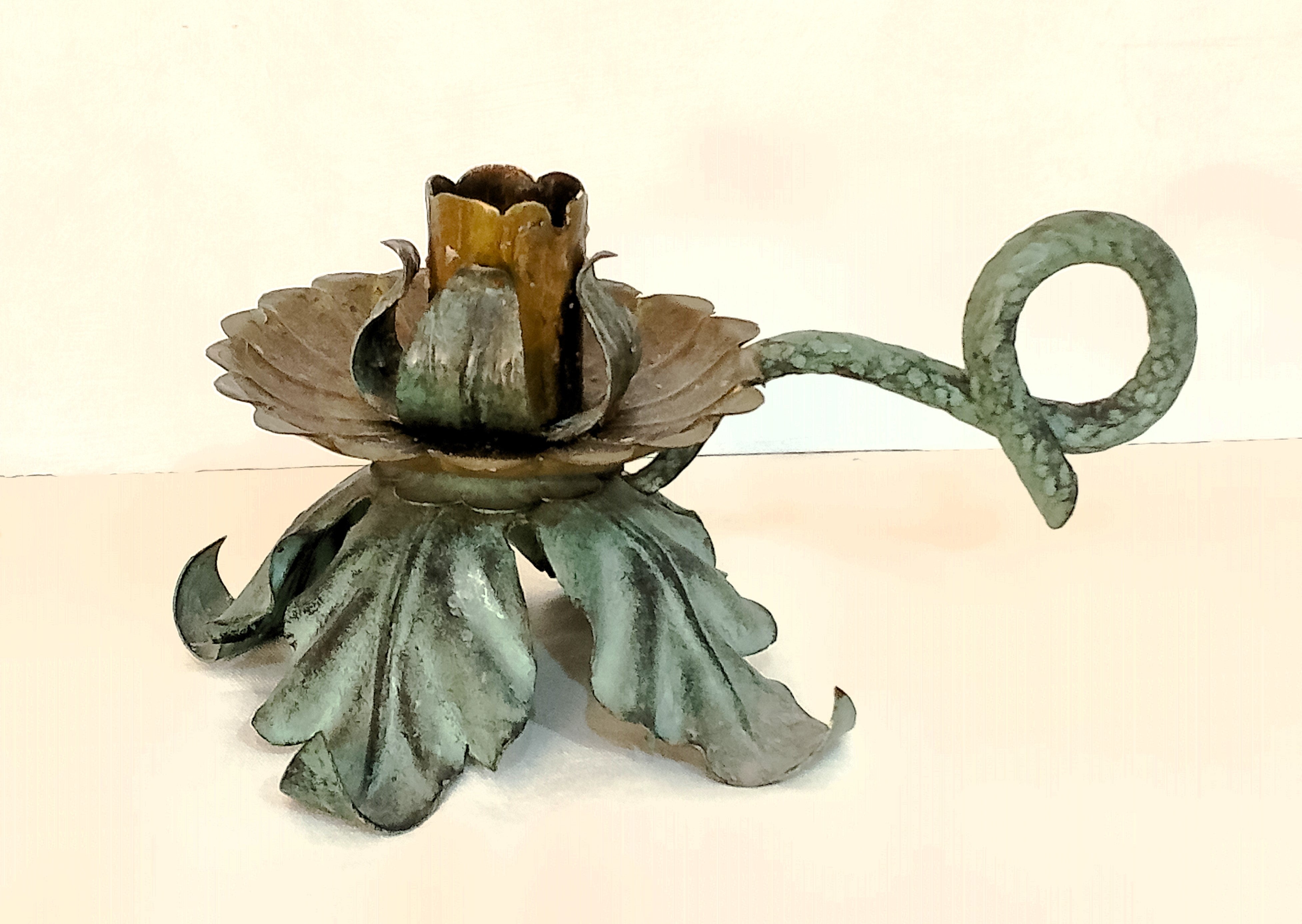 Portavelas metálico con efecto bronce patinado. Con un motivo floral simulando hojas, Medidas 17X9X10 cm